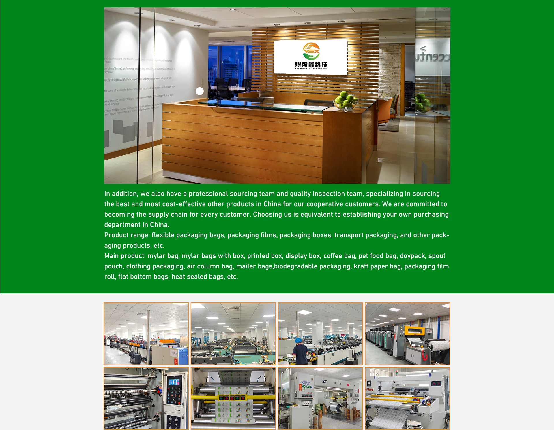 Productos principales:Bolsas de embalaje flexibles, pelรญculas de embalaje, caja de embalaje, embalaje de transporte, embalaje biodegradable